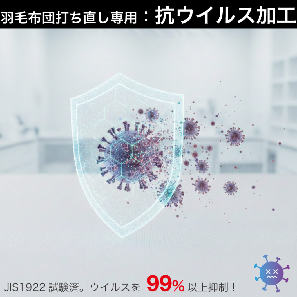 中の羽毛全体にウイルス加工を施し定着させています。特定のウイルスの数を99%以上低減。抗ウイルス加工の効果は約2年以上継続されます。