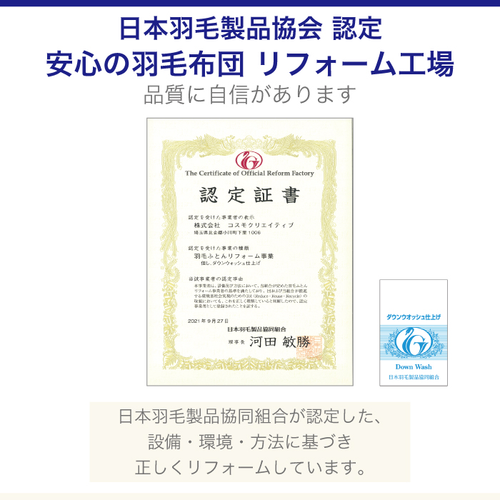 日本羽毛製品協同組合より「ダウンウォッシュ仕上げ」の認定を得た安心の羽毛布団です。