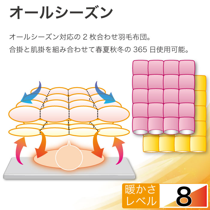 四季を通して使用でき、ホックを外して春秋は合掛1枚で、夏は肌掛1枚で、冬はホックを付け2枚合わせて本掛として使用できる便利な羽毛布団です。