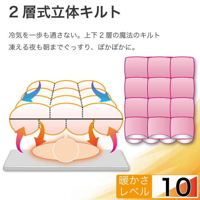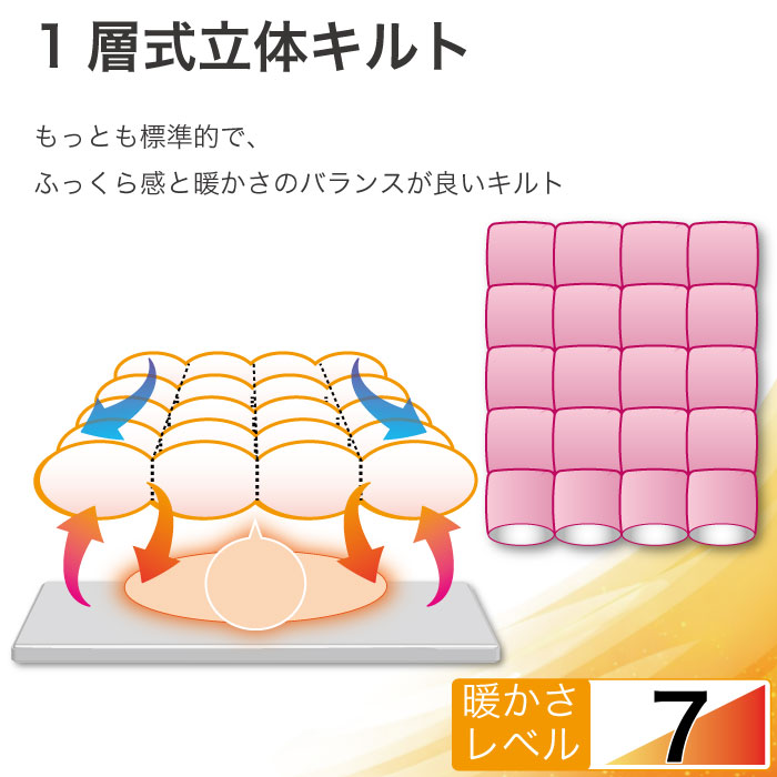 現在最も多く流通している立体キルト。寒い地方でのご使用はちょっと不安ですが、暖かい地方でのご使用ならこちらでも十分と言えます。