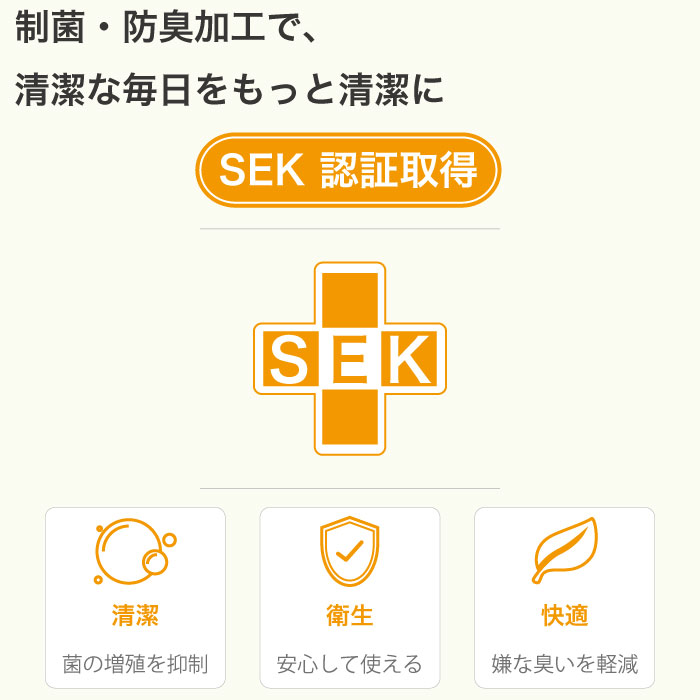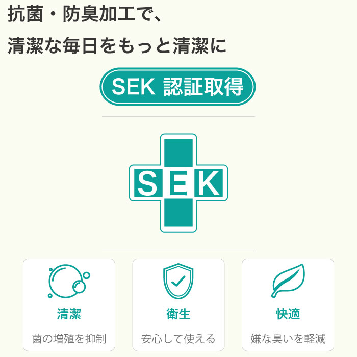 SEKマークは、一般社団法人繊維評価技術協議会(JTETC)が実施する認証制度(業界自主基準)です。同協議会では、抗菌防臭加工を施した繊維製品の表示用語、評価方法・基準、安全性などに自主基準を設け、基準に合格した商品には「SEKマーク」を表示できるマーク制度を実施しています。「S=清潔」、「E=衛生」、「K=快適」これらの頭文字を合せてSEKと言います。